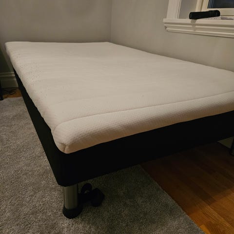 Specialbeställd säng utförd av finsnickare. Ger rum för mycket förvaring på liten yta. Fem utdragbara lådor. Trappan är hopfällbar och kan skjutas in i sängen, också den rymmer ett förvaringsfack. Madrass och bäddmadrass ingår. 120-säng från Mio (20 år) + bäddmadrass Ikea Tuddal. Runt madrassen finns 10 cm luft och det är enkelt att bädda och dammsuga runt. Stomme av björk och lådor av snickeriplyfa i björk. Sängen är vitmålad och i gott skick. Endas ramen upptill ovan trappan är nött i färgen. Enkelt att bättra på med lite färg. Säljes p.g.a. flytt.