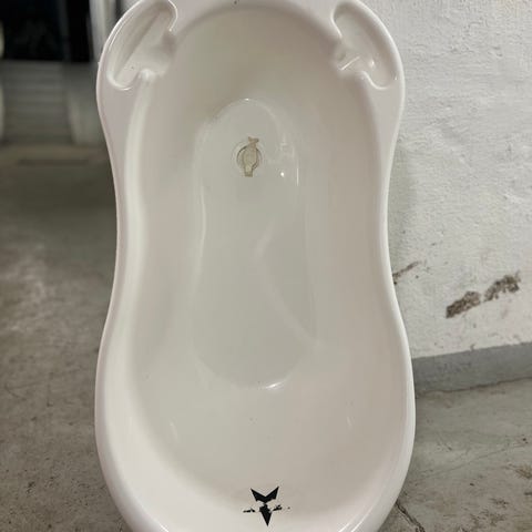 Badbalja + babyinsats/badstöd/badstol använda sparsamt av ett barn. Ställningen i stål är lite äldre men fungerar utmärkt. Sugproppar på badstödet att fästa i badkar eller badbalja. Hämtas i Tyresö