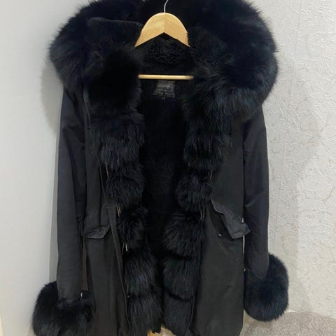 Varm Vinterjacka med stor luva i storlek Medium från butiken Garoff ( Solna centrum) . Använd endast två gånger !