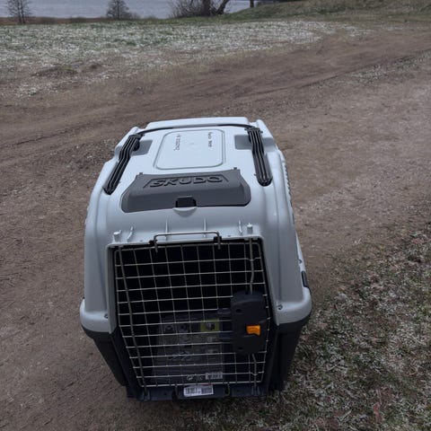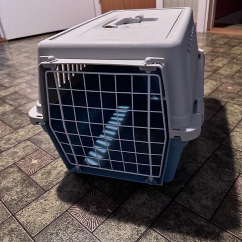 Transportbur för husdjur tillverkad i plast med en metallgrind framtill. Buren är avsedd för transport och förvaring av små till medelstora djur. Den har ventilation på sidorna och ett handtag för enkel bärning. Buren visar viss användning med repor och mindre skador på ytan.