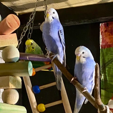 Dom har stimulerande leksaker i olika material/former/färger men dom är placerade mot kanterna så det finns utrymme för fåglarna att flyga i buren.