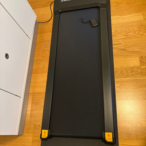 Grått gåband med topphastighet på 6 km/h. Enkelt att hantera då det väger 25 kg och enkelt kan skjutas eller dras, tack vare hjulen på ena sidan. Intuitivt startsystem, det räcker med tre steg på bandet för att starta det.