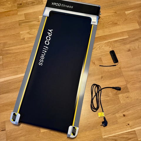 Hastigheten justeras genom att gå längre fram på bandet för att öka hastigheten, och längre bak för att minska. Displayen visar hur långt du har gått, antal steg och tid. Ljudnivån är endast 65 dB. Ingen installation krävs, det är bara att ansluta sladden till ett eluttag och börja gå.