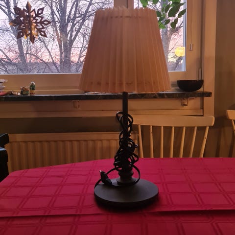 Stor svart med skärm 62 cm hög, 36 cm diameter. 150 kr.