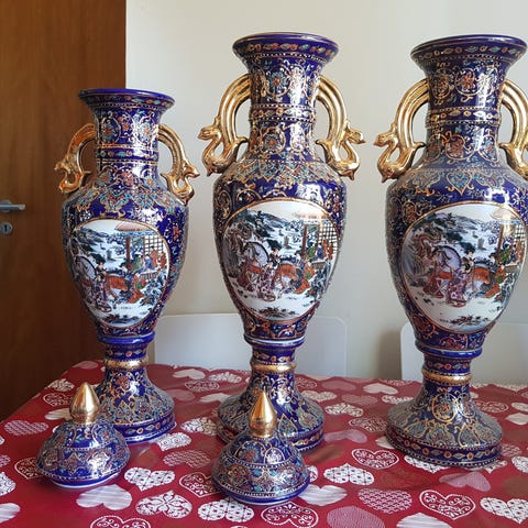 Handmålad kinesisk vas i keramik med dekorativa motiv av blommor och fåglar. Vasens färgschema domineras av gult med inslag av rosa, blått och grönt. Den har en smal hals och en något vidgad öppning med mönster runt kanten. Ifrån 1900 talet. Skadad och lagad i kanten på öppningen. Se bilder. Höjd 29 cm, och bredd 8 cm. Pris 250 kr