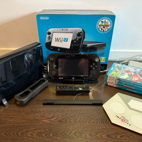 Nintendo Wii spelkonsol inklusive två Wii Remote-kontroller, sensortång, strömkabel, hdmi-kabel, laddningsstation och spel Super Mario bros och Super Luigi U, Super Paper Mario och Super Mario 3D World. Konsolen är svart och tillbehören är kompatibla med Nintendo Wii-systemet.