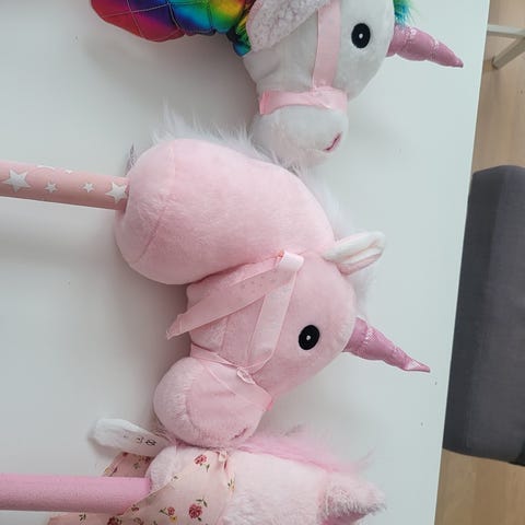 2 st käpphästar enhörning men hjul. På pinnarna har lite färg skavt av. Säljes för 20kr/st