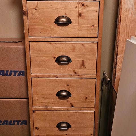 Byrå från slutet av 1800-talet / början av 1900-talet. Massiv furu. Senare bemålad i grågrön färg. Inköpt på Stockholms Auktionsverk.