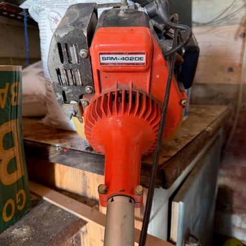 Tanaka TBC-230BS röjsåg med tvåtaktsmotor och handtag. Utrustad med skydd för trimmerhuvud och handtag för styrning. Används för att trimma gräs och hantera vegetation i trånga områden.