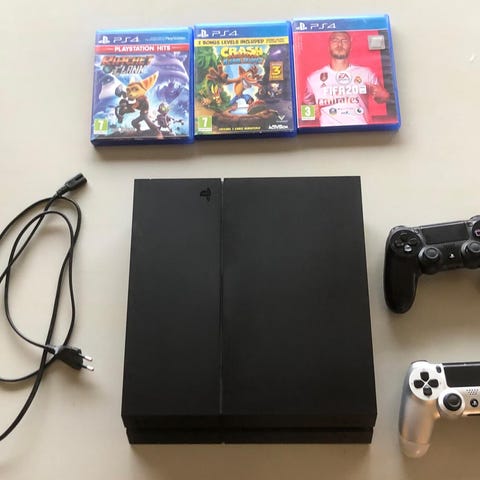 Playstation 4 spelkonsol inklusive två handkontroller och fyra spel.