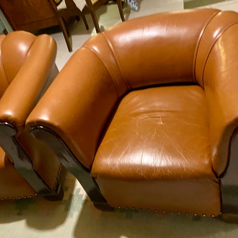 Brun fåtölj i skinn. Skinnet har blivit förstört på ena armstödet samt att en katt klöst på samma sida, bild 3. På baksidan har några av nubbarna lossnat, bild 2. Två av skinnknapparna saknas. Bra i fjädringen/sitsen.