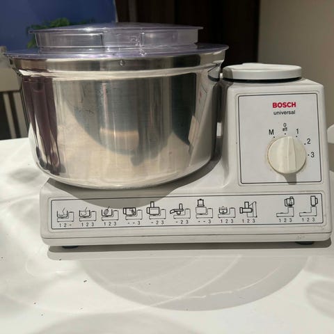Har några år på nacken men fungerar bra. Många tillbehör är oanvända. Passar framförallt mindre degar.