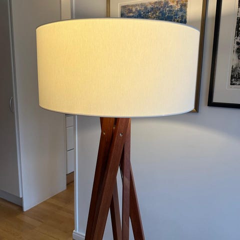 Golvlampa från 2009 från Kamelo som har en lampskärm med strutsfjärdrar. Väger ca 19kg
