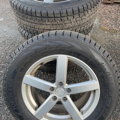 Håller nån säsong till, mönsterdjup ca 4-5 mm, dubb ganska slitna. Fälgar Volvo orginal i helt ok skick!