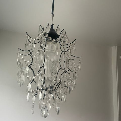 Taklampa i svart metall med dekorativa glasprismor. Passar för takmontering och ger ett klassiskt utseende med sina hängande prismor.
