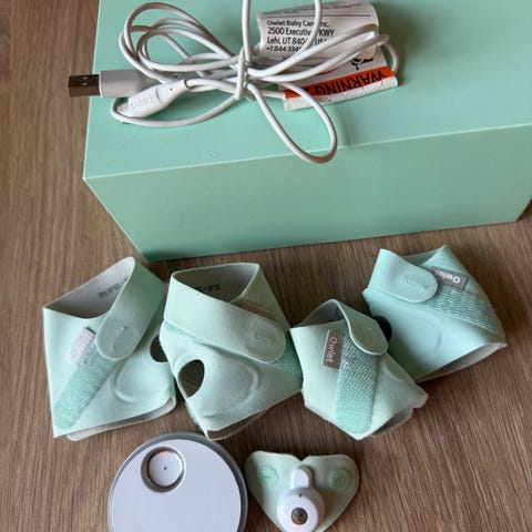 Owlet Smart Sock babyövervakning används för att övervaka spädbarns hjärtfrekvens och syrenivåer. Produkten levereras i originalförpackning med tillbehör inklusive laddare och sensorer. Färgen är mintgrön.