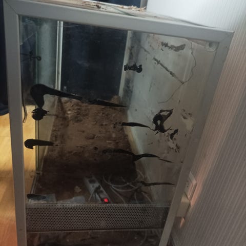 Platsbyggd, mycket robust terrarium. Exteriör och interiör (marinplaywood) på reglar. Står nå hjul. Bortskänkes mot avhämtning. Armatur men inte vattensystem följer med. Mindre skador på lack men i övrigt i fint skick.