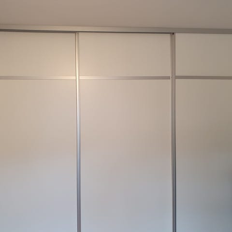 3 skjutdörrar från Pelly. 2 st vita och en med spegel, dörrarna är 58 cm breda. Säljes komplett med tak- och golvskena med två spår för dörrarna. Höjd avser dörrens höjd, justeringsmån finns på dörren. Total bredd är för golvskenan.