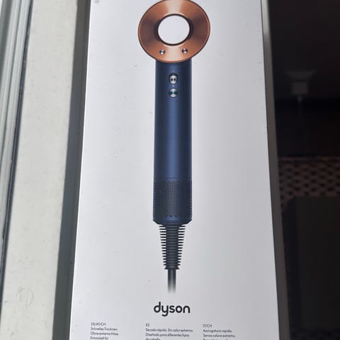 Dyson Supersonic hårfön inklusive flera munstycken och tillbehör. Produkten har en grå och rosa färgkombination och levereras med strömkabel och bruksanvisning. Säljer denna då den inte kommit till användning eftersom att jag fick denna i present och det var fel modell.