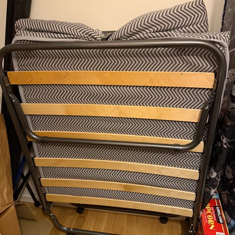 Jysk resårsängar med tillhörande madrasser (2x80 cm). Sängarna och madrasserna är i svart och vitt. Passar för enkel- eller dubbelsängs bruk beroende på placering. Material och storlek är standard för Jysks slängprodukter. Madrasser har tvättbara överdrag.
