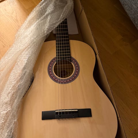 Suzuki Akustisk gitarr av klassisk typ. Gitarren har en träfinish och är avsedd för allmänt bruk. No 12. Säljes i befintligt skick
