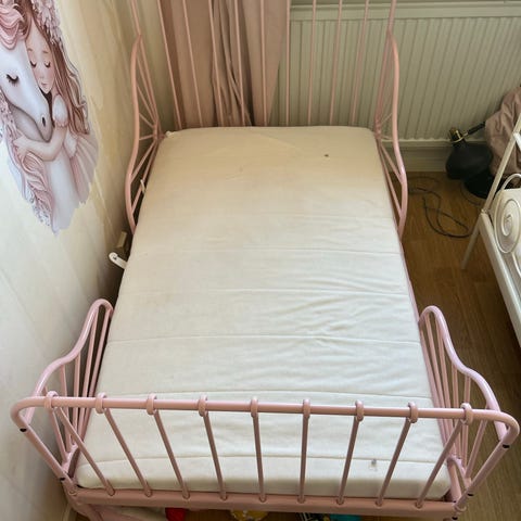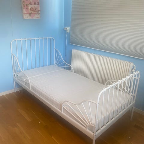IKEA utdragbar säng för barn. Sängen är i metall med en vit färg och har en utdragbar funktion för att kunna användas länge när barnet växer. Passar för barnrum och kan anpassas efter behov.