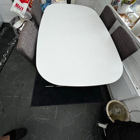 Bordsskivan har bytts håll på då den ursprungliga ovansidan skadades vid ett misslyckat försök med dekorplast. För att slippa ha den fula sidan uppåt har jag gjort egna hål i den egentliga ovansidan för att kunna fästa skivan. De ursprungliga skruvhålen är därför synliga i mitten av bordet. Det finns även en liten fläck på kanten av den nya ovansidan. Se bilder. ”Foten” är i bra skick.