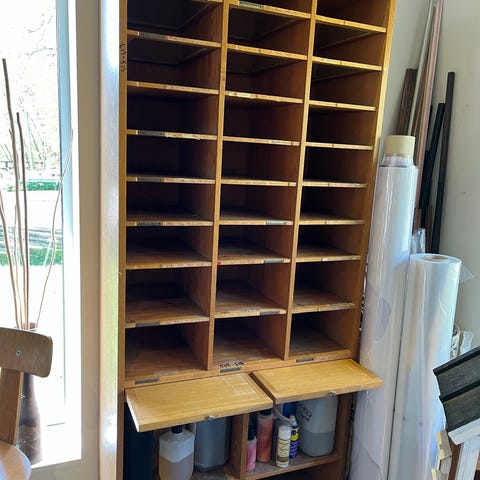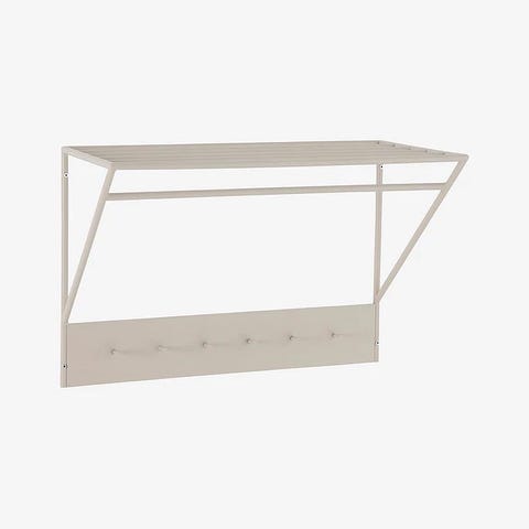 Träbokhylla med flera metallfack för förvaring av tidskrifter eller böcker. Utrustad med en horisontell stång med svarta klädhängare. Passar för användning i entréer eller kontorsmiljöer för organiserad förvaring av läsmaterial och ytterkläder.