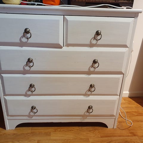 Målad byrå med "guld" knoppar. Lite trög i vissa lådor. Behöver hämtas innan den 2 januari.