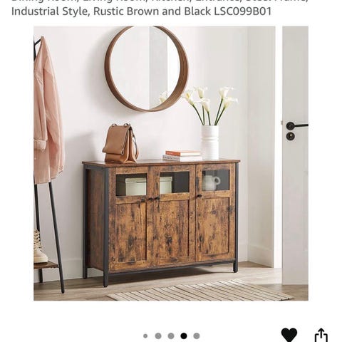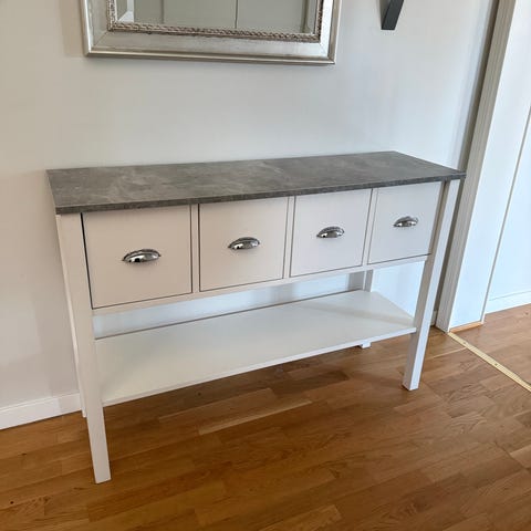 Vit skänk med skåp och lådor. I skåpen finns hyllor av glas. Bra utdragbara lådor gjorda av furu. Furuskiva ovanpå som är laserad. Skänken har små metallben. Den är gedigen och ganska tung. Säljes p g a flyttning.