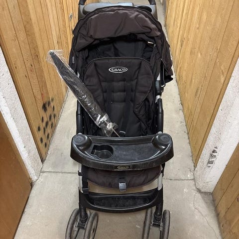 Graco barnvagn med svängbara hjul fram och ett handtag för enkel styrning. Den är hopfällbar för smidig förvaring och transport. Inklusive regnskydd. Handtag är skadad.