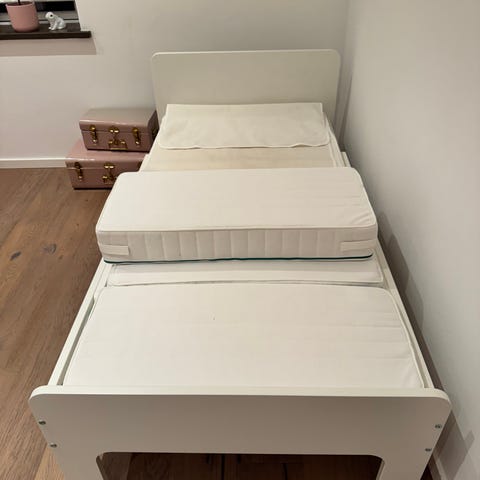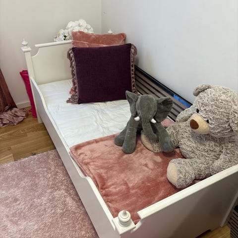 Fin säng säljes. Sparsamt använd. Medföljer tyg som kan hängas över sängen så att det blir som ett mysigt 'tält'. Två lådor under sängen. Passar för en 90 cm madrass. Själva stommen är 120 cm på kortsidan och 210 cm på långsidan.