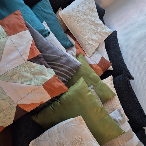Soffkuddar 50.-/st, 1 med tåg på, 2 beiga med guldränder, 1 ljusgrön ca 55x55 cm per kudde