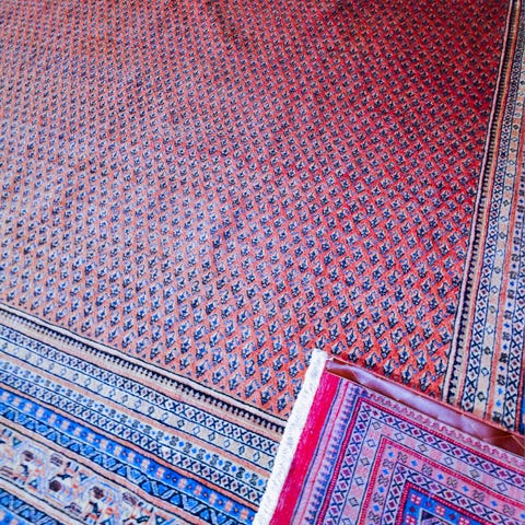 Mattan är oanvänd och i nyskick. Handknutna mattor av denna typ är mycket eftertraktade och kostar ofta betydligt mer i butik. Detta är ett perfekt tillfälle för dig som söker en tidlös, exklusiv och värdebeständig matta.