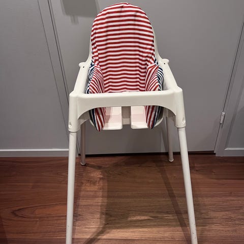 Säljes en hög antilop barnstol från IKEA med uppblåsbar dyna och fodral, allt i fint skick.