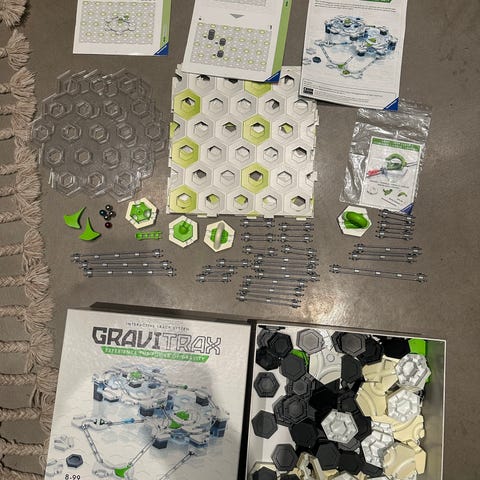 Gravitrax Starter-set barnleksak med över 100 komponenter för att bygga och utforska gravitationsbaserade banor. Setet innehåller olika delar i transparent och grönt material för kreativt byggande och lek.