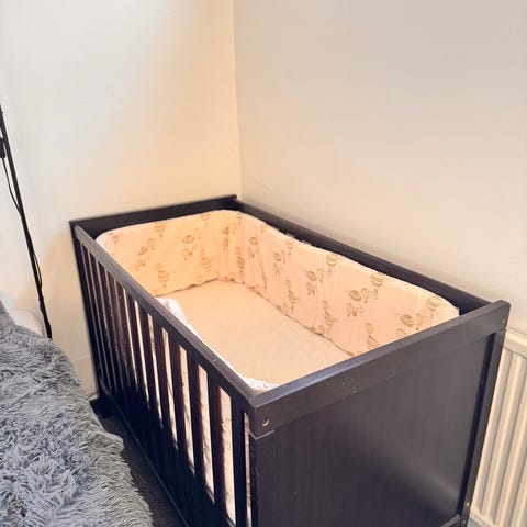 Egentillverkad hus för säng 90cm. Tillverkad av plywood. Sänglampa ingår. Finns märken efter tejp mm. Lite ny färg så är de som nytt.