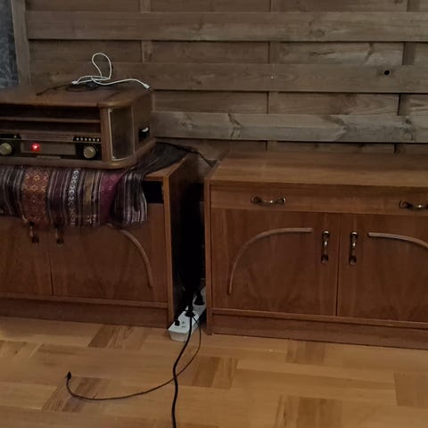 Bokhylla i Mahogny faner från MIO i fint skick förutom ett gångjärn till en dörr som bör bytas, syns höger på bilden.. Dubbla vitrinskåp. Handtag till skåp och lådor finnes. Bortskänkes mot avhämtning. Tv och tavla ingår ej. Snarast pga. flytt annars hamnar den på tippen.