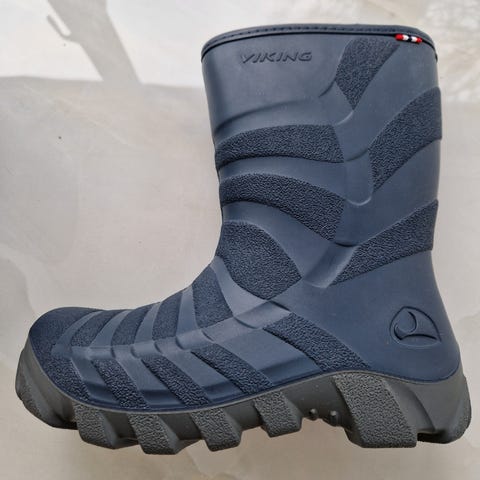 Mörkblå gummistövlar Viking Ultra i storlek 31 och 32. De i storlek 32 är namnade och de i storlek 31 är onamnade.