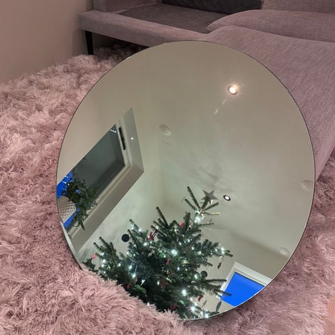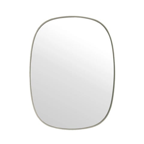 Aarikka spegel med en stor, vit dekorativ ram med ornamentdetaljer. Spegeln har en rektangulär form och en robust design, lämplig för väggmontering i olika rum.