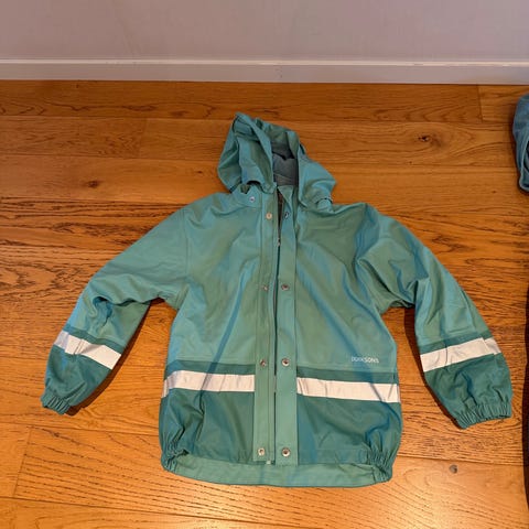 Didriksons regnställ i storlek 130 för barn, unisex. Tillverkade i polyester med gul och mörkblå färg. Setet består av en regnjacka med tryckknappar och regnbyxor med hängslen, avsedda för utomhusbruk och skydd mot regn.