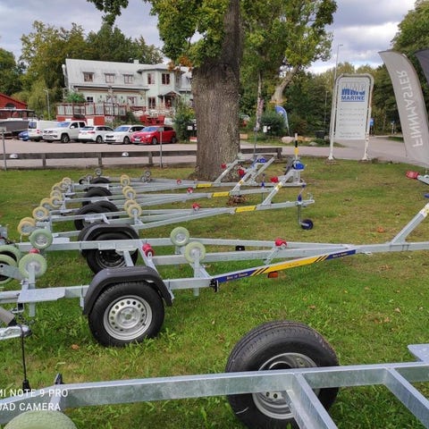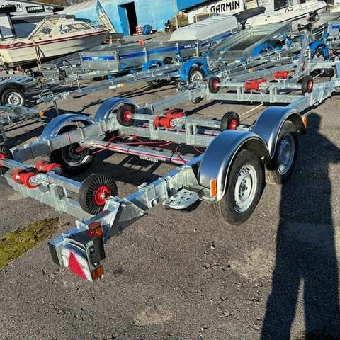 För båt upp till 24 fot, ( samma som 241990 ), lastar 1480kg. Självjusterande vaggor och 2 extra stöd, extra utrustad med reservhjul och låda för spännband och domkraft m.m. Vattentäta bakljus. Använd 2 ggr. Lite solblekta skärmar.