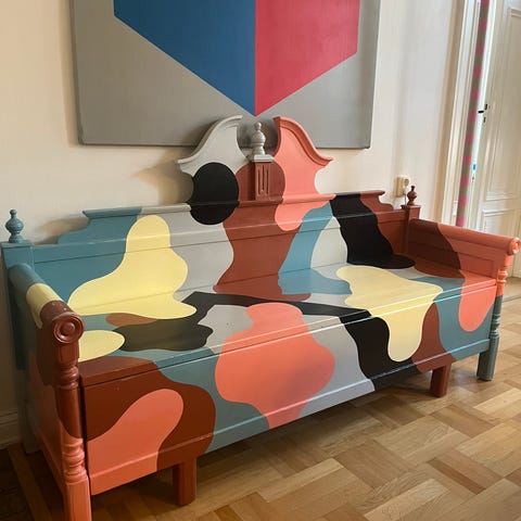 Nätt kökssoffa med förvaring under locket. Bra skick men färgen är avskavd på flera ställen.