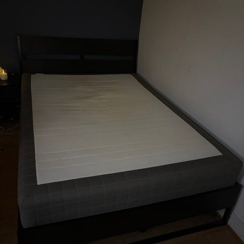 Sängram med tillhörande madrass och quiltat överkast i grå färg. Överkastet ingår inte!!Sängens mått är cirka 140 cm x 200 cm. Madrassen har några fläckar på ytan, som syns på bilder. Finns fler fläckar .