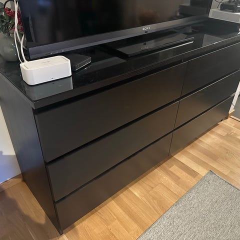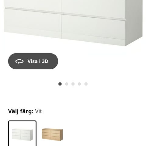 Vit dubbelbyrå från Ikea " malm " 160 cm bred. Rymmer mycket. En liten skada upptill i kanten, se bild!!!, annars I oktober begagnat skick. Nypris 1795. Finns I Valla intill syrenparken. Swish. Obs finns 2,5 trappa upp utan hiss så ta med stark bärhjälp!