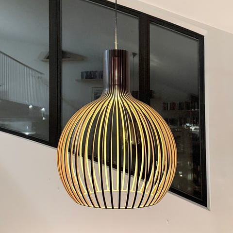 Säljer en mycket stilren och exklusiv KUULTO 9100 plafond i svart. Lampan är ett fantastiskt hantverk i formpressad björk från de finska skogarna och ger ett varmt, mjukt ljus som skapar en ombonad känsla i rummet. En ovanlig och elegant plafond där trä möter modern, minimalistisk design.