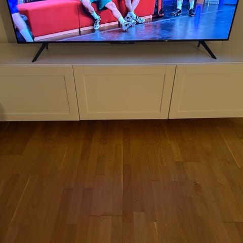 IKEA BRIMNES TV-bänk i vit färg. Möbeln har två öppna fack och två lådor med frostat glasfront. Passar för förvaring och placering av TV och tillbehör.