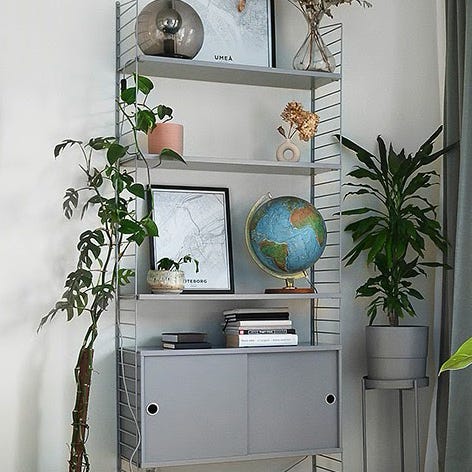 String My String hylla i trä och metall. Hyllsystemet består av flera hyllplan och skåp i trä, monterade på metallstativ. Designad för flexibel förvaring och display av olika föremål. Passar för användning i vardagsrum eller kontor.