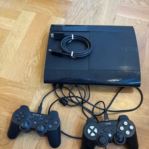 Sony Playstation 3 spelkonsol. Inkluderar flera spel, bland annat Minecraft, Disney Infinity, Sonic och Need for Speed. Konsolen är svart och levereras med två trådlösa handkontroller.