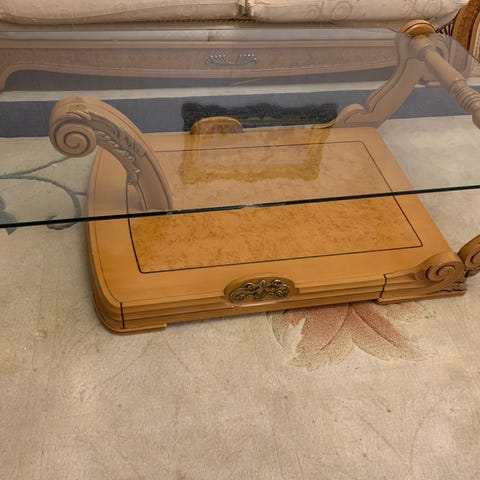 Soffbord inköpt från Jotex 2023. Glasskivan är lös och benen kan man flytta hur man vill ha dem